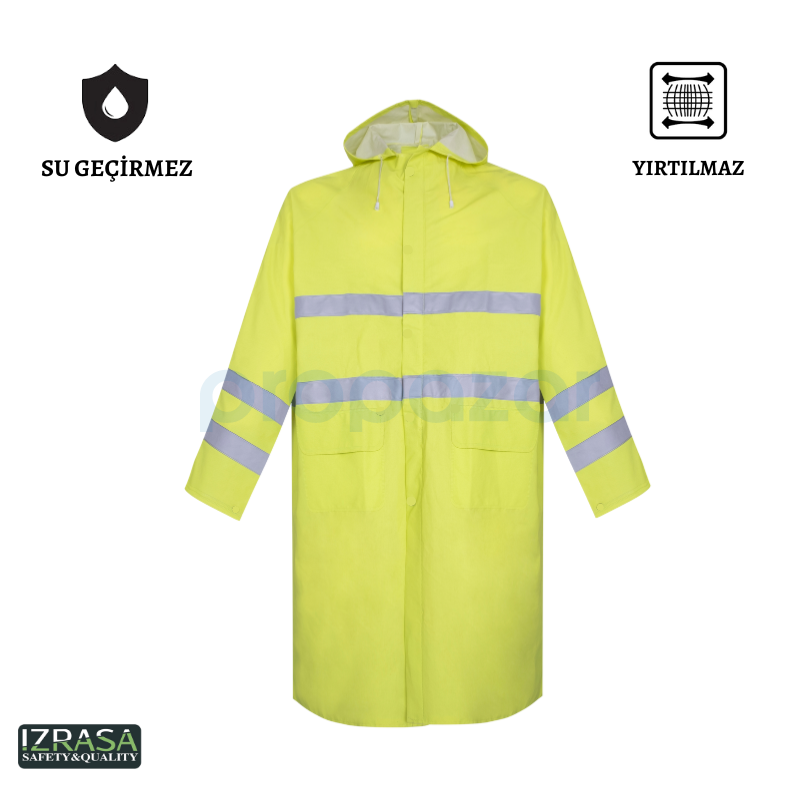 Izrasa NM-05/R Sarı, düşük ışık koşullarında görünürlüğü artırmak için çift sıra 5 cm reflektör şeritlerle donatılmış, pardesü kesimli ve astar destekli profesyonel yağmurluktur. 0,32 mm PVC dış yüzey, fermuar + çıtçıt kapama ve ayarlanabilir kapüşon ile hem dayanım hem konfor sunar.
