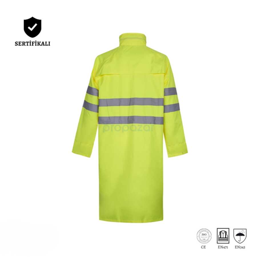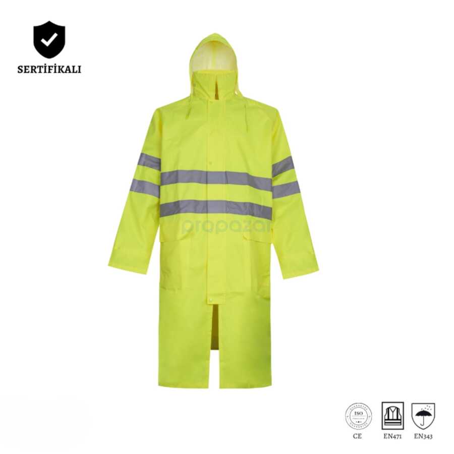 Izrasa SJ01, zorlu hava koşullarında güvenilir koruma ve yüksek görünürlük sunan, 300D Oxford PU kumaşlı, astarlı ve pardesü boy (≈120 cm) bir yağmurluktur. 5 cm reflektör şerit ve gizli kapüşon ile gece/gündüz fark edilirliği artırır. Renk: Neon Sarı.